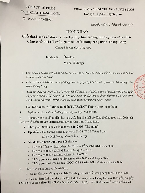 Thông báo chốt danh sách cổ đông họp ĐHCĐ năm 2016